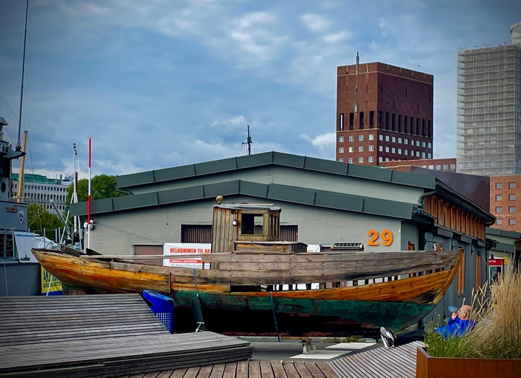Fiskebåten Vesla på vein fra Bleikøya til sentrum. Båtbygger Guldbransen sitter i rullestol. Foto: Skjermdump fra NRK.